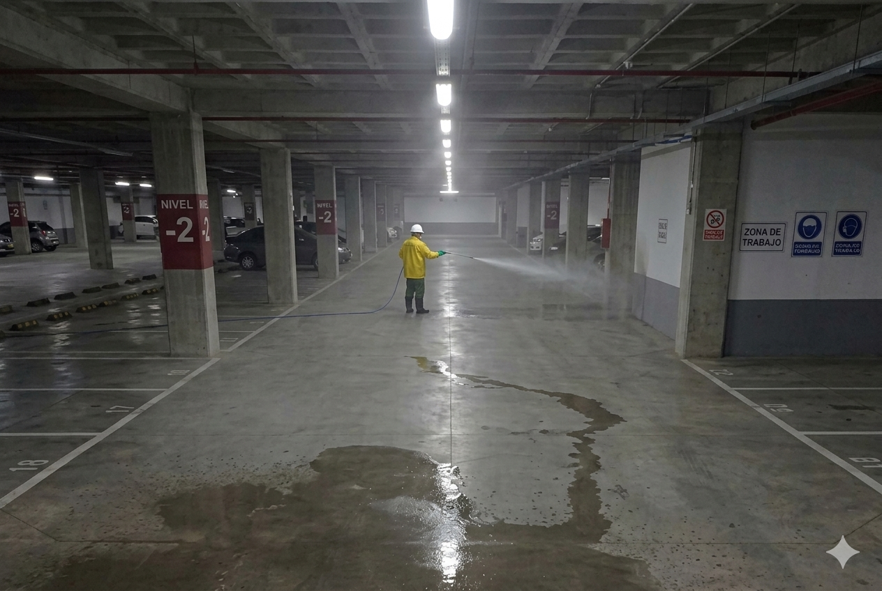 Limpieza profunda de estacionamientos subterráneos y en superficie para eliminar manchas de aceite, polvo fino y residuos de tráfico vehicular. Contribuye a mejorar la seguridad, la estética y la mantención de los pavimentos.